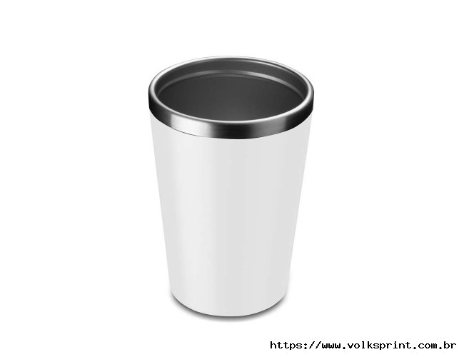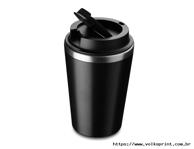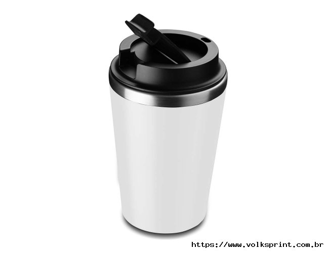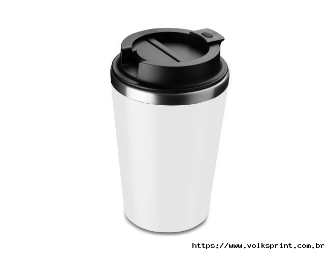 Copo de 350 ml com parede dupla, interior em inox 304 e exterior em plástico PP, tampa em plástico PP e acabamento com pintura fosca.