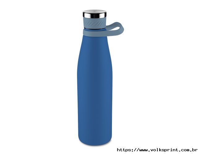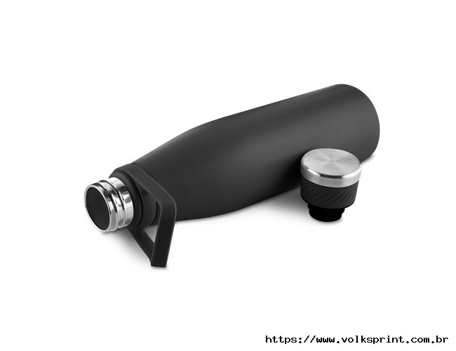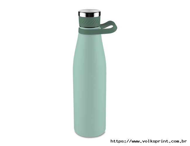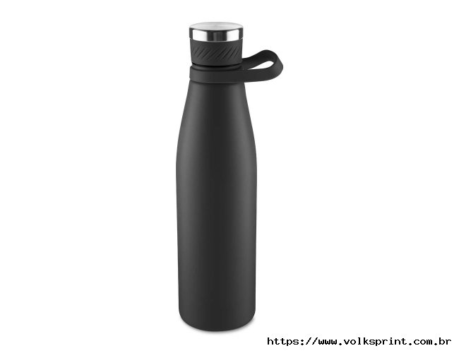 Garrafa térmica de 750 ml com parede dupla em inox (interno 304 / externo 201), acabamento com pintura a pó e tampa em inox 201 com anel de silicone para vedação, possui alça em silicone para transporte.