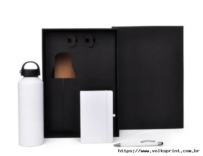 Sugestão de PersonalizaçãoUma gravação a Laser na garrafa e caneta; uma gravação em Silk/Digital no caderno e tampa da caixa.