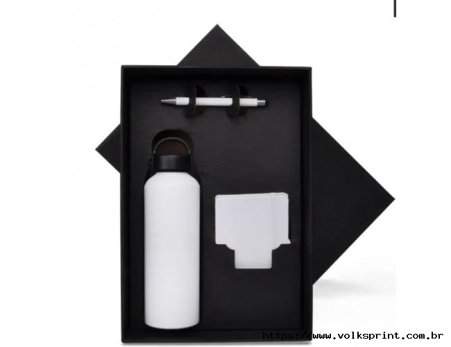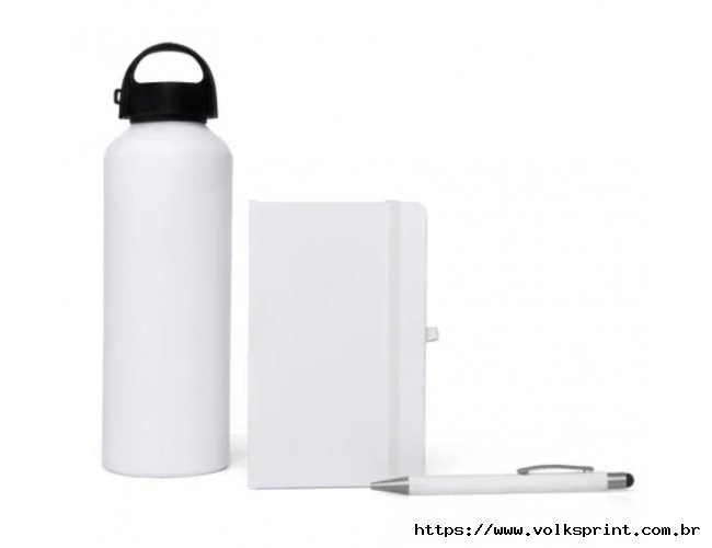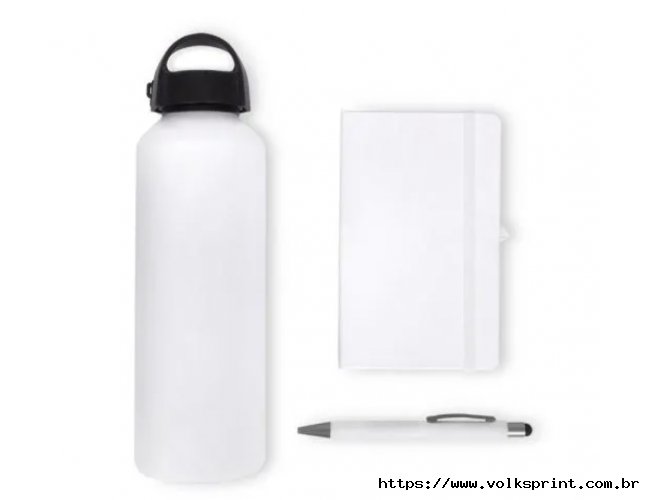 Kit boas vindas. Conta com garrafa branca em alumínio com capacidade de 600 ml; caderno para anotações branco com capa dura e caneta esferográfica em alumínio branca