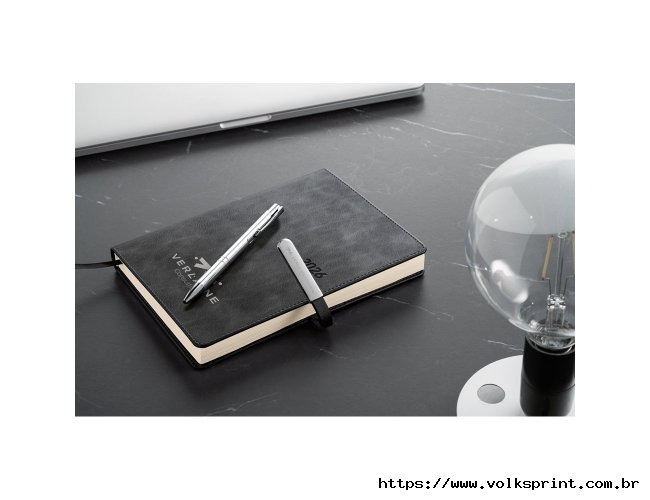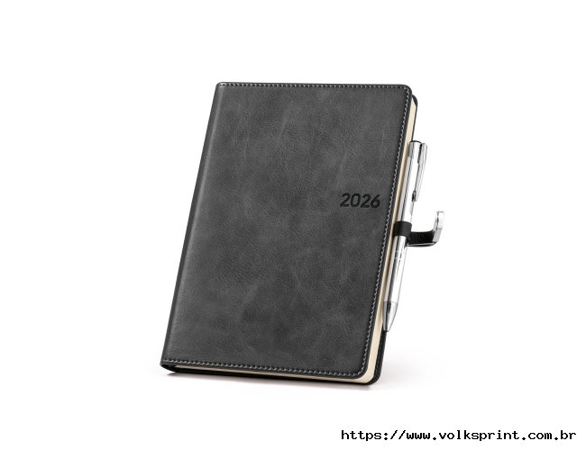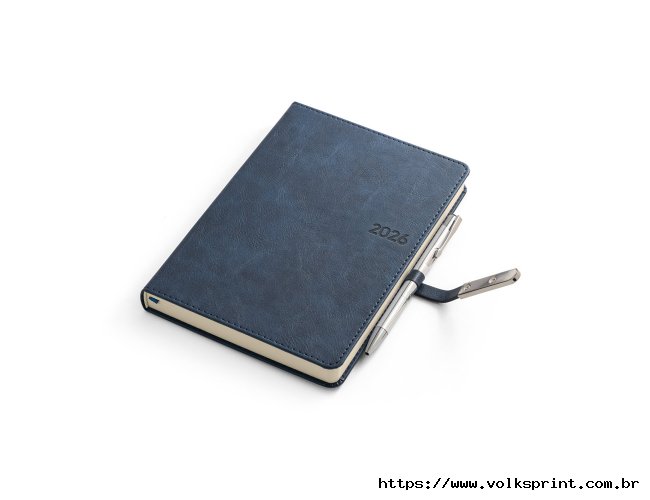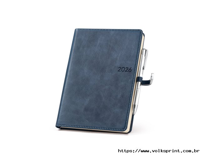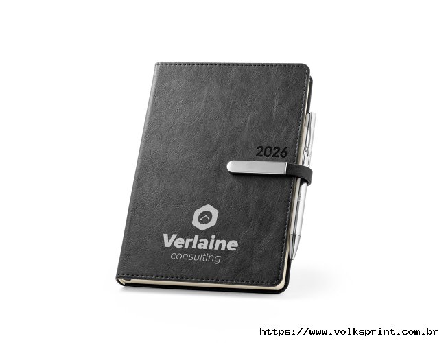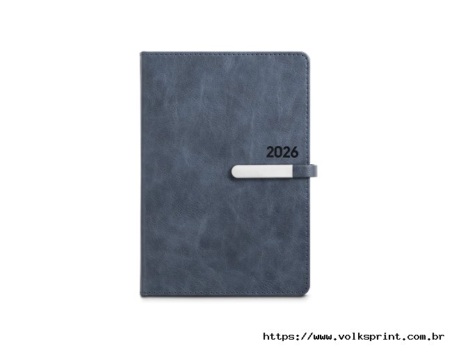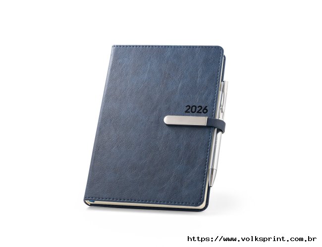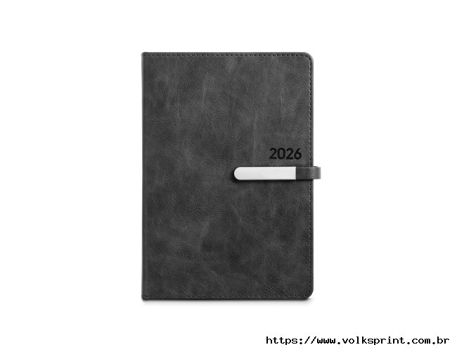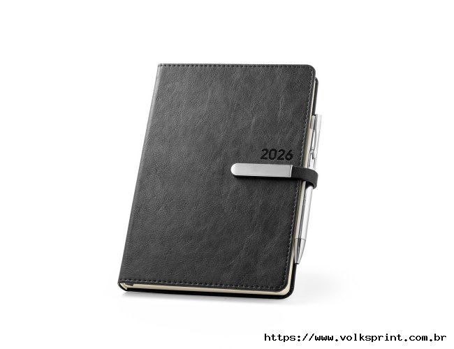 Agenda B5 em PU, com fecho magnético e peça metálica brilhante. Possui um suporte para esferográfica (inclusa) e marcador em fita. Está organizada num plano diário (70 g/m²). Fornecida com bolsa de non-woven. 148 x 210 mm | Bolsa: 205 x 250 mm